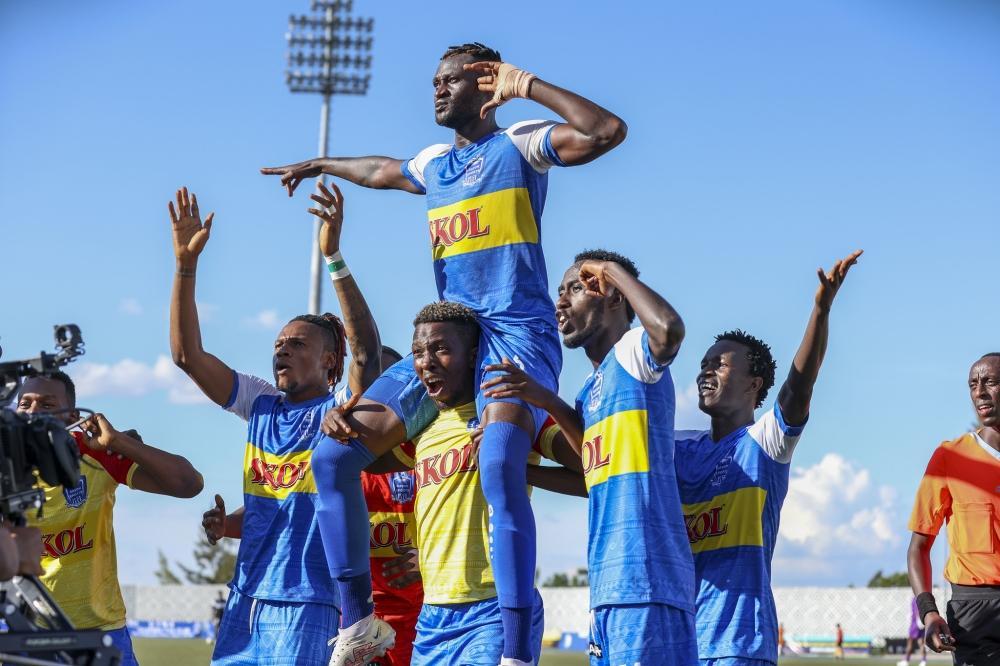Rayon Sports goal scorer Eric Ngendahimana celebrates with his teammates after shocking APR FC 1-0 to win the 2023 Peace Cup title at Huye Stadium on June 3. Olivier Mugwiza