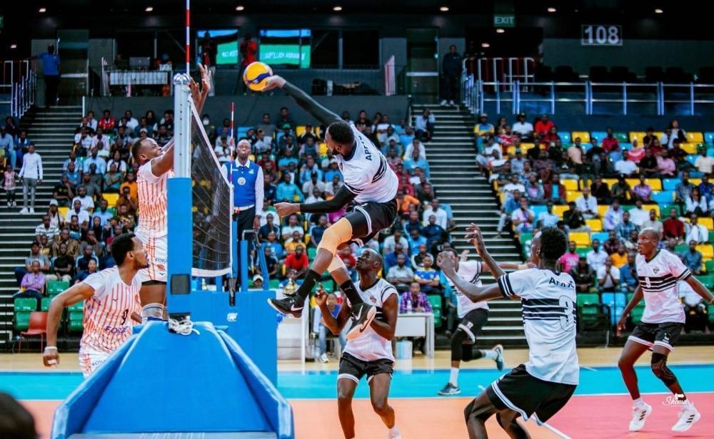 An APR makes a jump attack to power the ball into Gisagara’s ground during Sunday’s final at BK Arena.