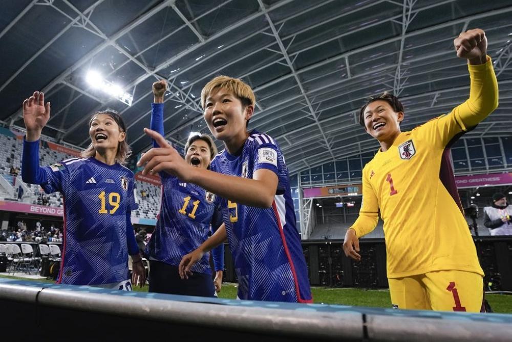 Japanese players from left, Miyabi Moriya, Mina Tanaka, Shiori Miyake and goalkeeper Ayaka Yamashita celebrate following the Women’s World Cup Group C football match between Japan and Costa Rica in Dunedin, New Zealand, July 26. AP-Yonhap