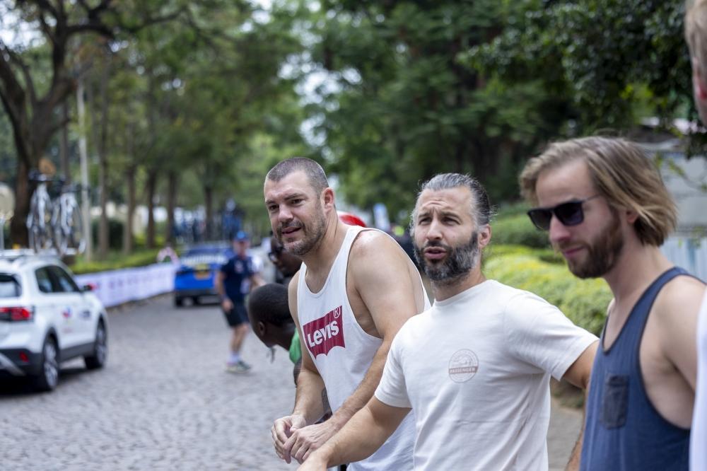 Team technician helps a rider after having a mechanical issue while climbing the cobbled street of Kimihurura.