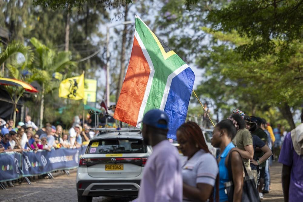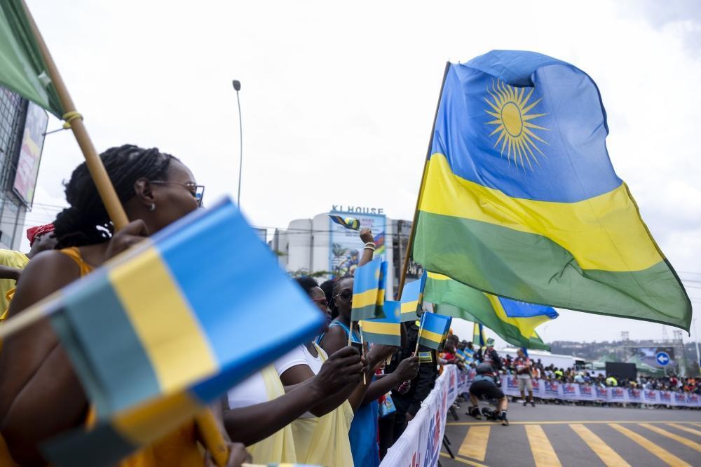 Fans wave the Rwandan national flag along the streets. To celebrate the 2025 UCI Road World Championships in Kigali, fan zones were provided with flags.