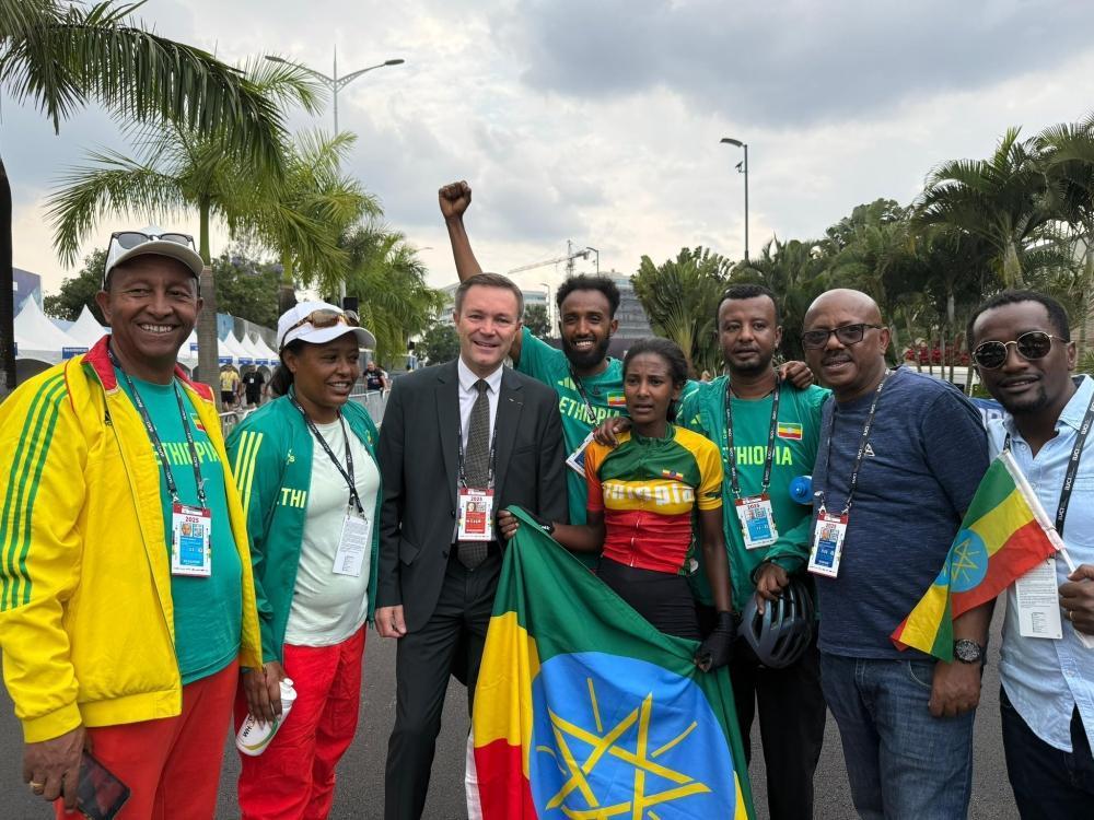 UCI President David Lappartient poses for a photo with Team Ethiopia following Ethiopia’s Tsige Kahsay performance to finishing the 7th position.