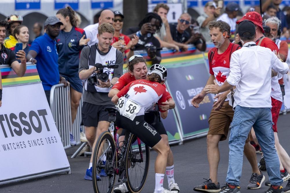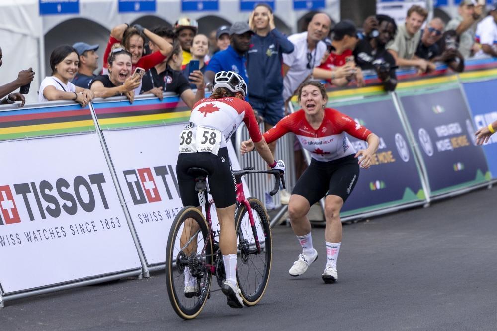 Magdeleine Vallieres’s teammate celebrates her victory after crossing the finish line