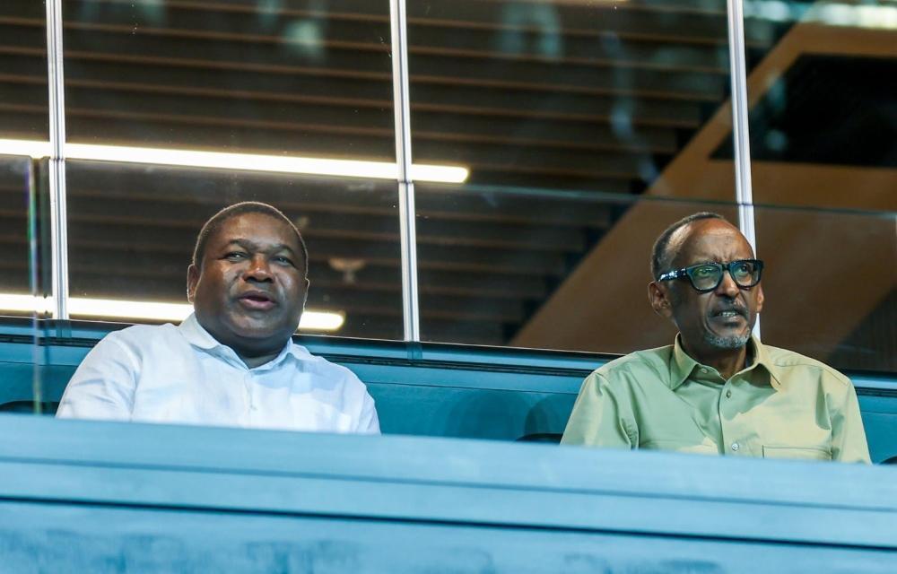 Mozambican President Filipe Nyusi (L) and his Rwandan counterpart Paul Kagame (R) were in attendance as Mozambique beat Guinea 99-40 on Saturday at BK Arena.
