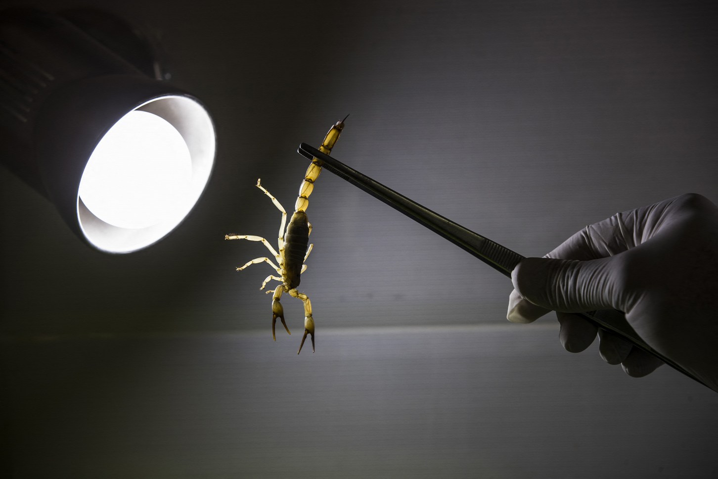 وضع أبو السعود قفازاته الواقية وأمسك بملقط معدني، وراح يبحث بجوار المبنى عن عقرب إلى أن وجد واحدا تحت حجر فالتقطه وأدخله إلى المعمل.