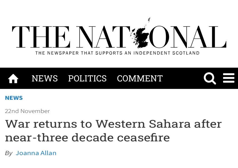 وعنونت الجريدة الإسكتلندية مقالها بـ”عادت الحرب إلى الصحراء الغربية بعد 29 عاما من وقف إطلاق النار” التي إندلعت يضيف المقال، بعد دخول الجيش المغربي منطقة الگرگرات، وهي “منطقة عازلة” تقع جنوب الصحراء الغربية التي يحتلها، قصد مواجهة المتظاهرين الصحراويين السلميين الذين كانوا يغلقون “ثغرة النهب” المغربي إلى موريتانيا.