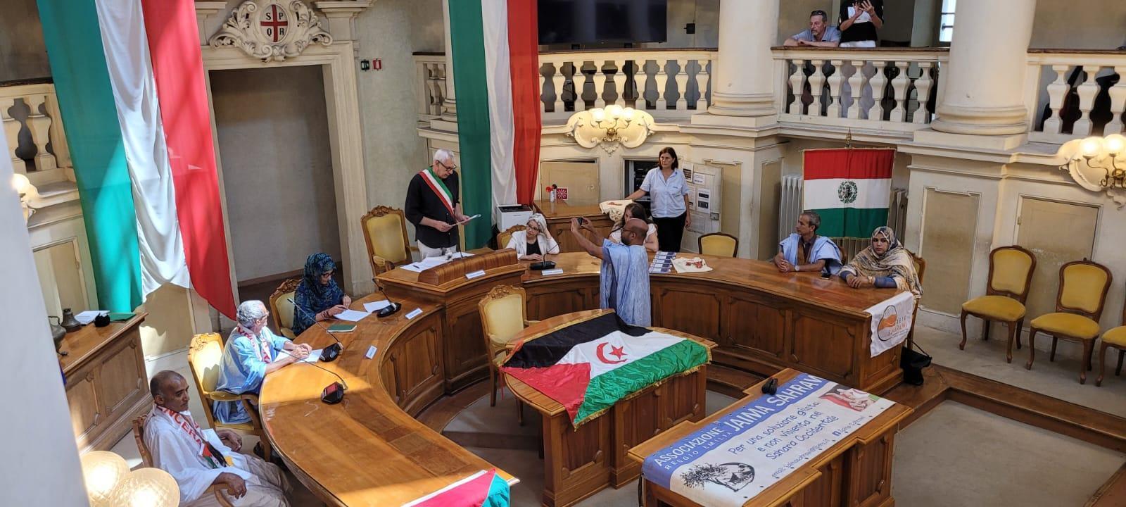 الاستقبال الذي نظم على شرف رسل السلام بصالة الالوان الثلاثة حضره كل من ممثلة جبهة البوليساريو بايطاليا فاطمة المحفوظ و السيدة مروة محمود المستشارة بريجيو ميليا و السيدة كاترين لوساردي رئيسة جمعية خيمة صحراوية الإيطالية و نائبة رئيسة شبكة التضامن الإيطالية مع الشعب الصحراوي.