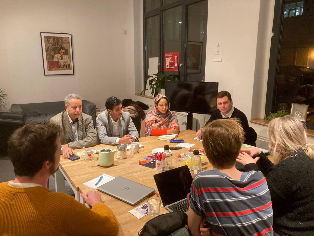 وخلال اللقاء الذي جرى بمقر الحزب الاشتراكي بسكسونيا، تحادث أعلي محمد سالم مع كل من ماريكي إنجلز، ماتس رودولف ممثل الشبيبة على مستوى مجموعة الجامعات بمدينة ليبزيغ، ميلان سواروسكي رئيس مجلس إدارة اليوسوس بليبزيغ، ليون دراهونفسكي عضو في مجلس اليوسوس بليبزيغ وعضو في مجلس مدينة الحزب الاشتراكي الديمقراطي.
