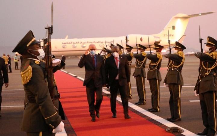 وأستعرض رئيس الجمهورية كتيبة من الحرس الجمهوري الأنغولي التي أدت له التحية الشرفية بأرضية المطار، قبل أن يجري مباحثات مع مستقبليه بالقاعة الشرفية للمطار .