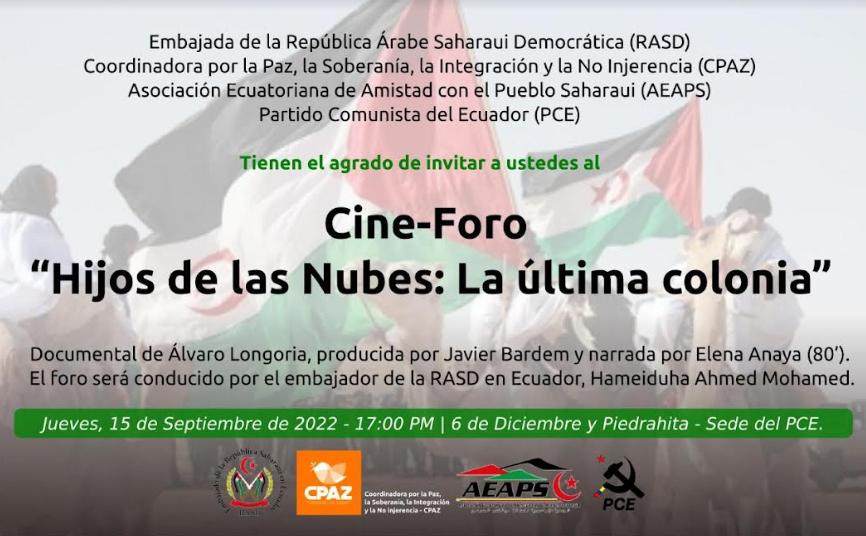 و أكد السفير الصحراوي بالاكوادور، بعد عرض فيلم وثائقي عن الصحراء الغربية، أن حق تقرير مصير الشعب الصحراوي و كفاحه المشروع بقيادة جبهة البوليساريو، يحظى بدعم متزايد من طرف حكومات وشعوب أمريكا اللاتينية.