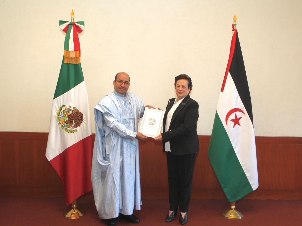 أفريقيا برس – الصحراء الغربية. استقبلت مديرة التشريفات بوزارة الخارجية المكسيكية ، مارتا سوزان سانشيز ، أمس الخميس بمقر وزارة الخارجية بمكسيكو ، السفير الصحراوي المعين، المخطار لبيهي ، لإستلام نسخة من أوراق اعتماده سفيرا مفوضا فوق العادة للجمهورية الصحراوية لدى المكسيك .