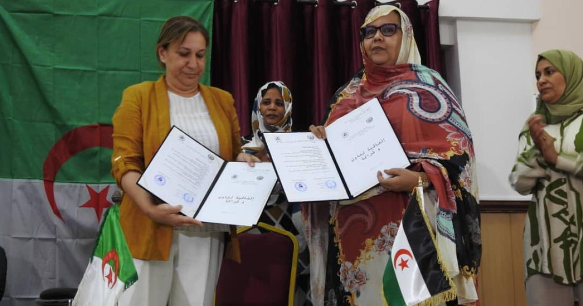 الإتفاق الذي تم على هامش أشغال الجامعة الصيفية لأطر الصحراوية بولاية بومرداس الجزائرية، وقعه عن الجانب الصحراوي الأمينة العام للإتحاد الوطني للمرأة الصحراوية الشابة سيني وعن الحانب الجزائري بن جودي دليلة رئيسة الجمعية.