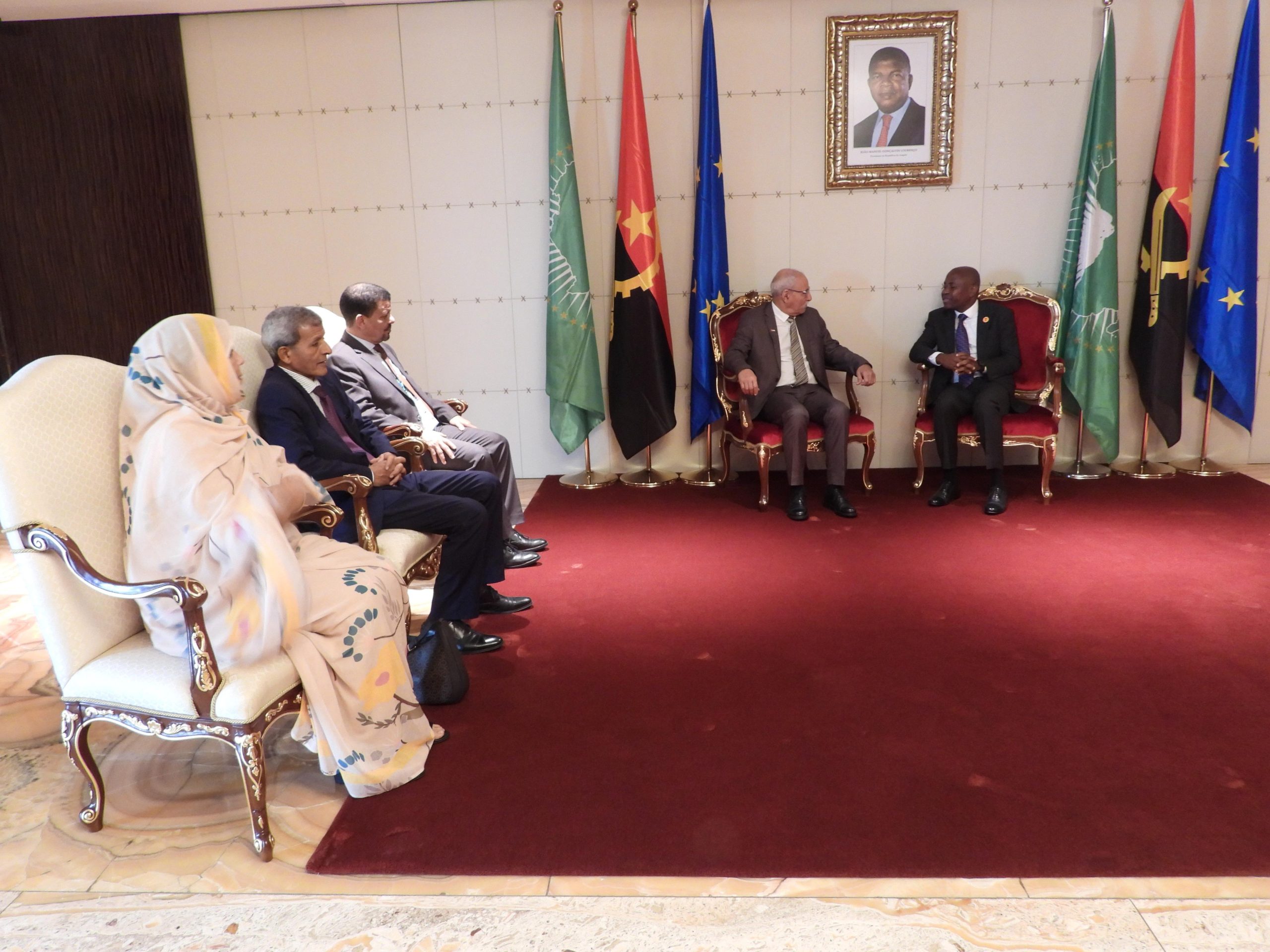 ورافق رئيس الجمهورية في زيارته لأنغولا وفد ضم: وزير الخارجية والشؤون الإفريقية محمد يسلم بيسط، السفير بأنغولا وناميبيا حمدي الخليل ميارة، المستشار برئاسة الجمهورية عبداتي أبريكة، المستشارة المكلفة بالعالم العربي النانة لبات الرشيد والسفير المكلف بتشريفات الرئاسة صلحة العبد.