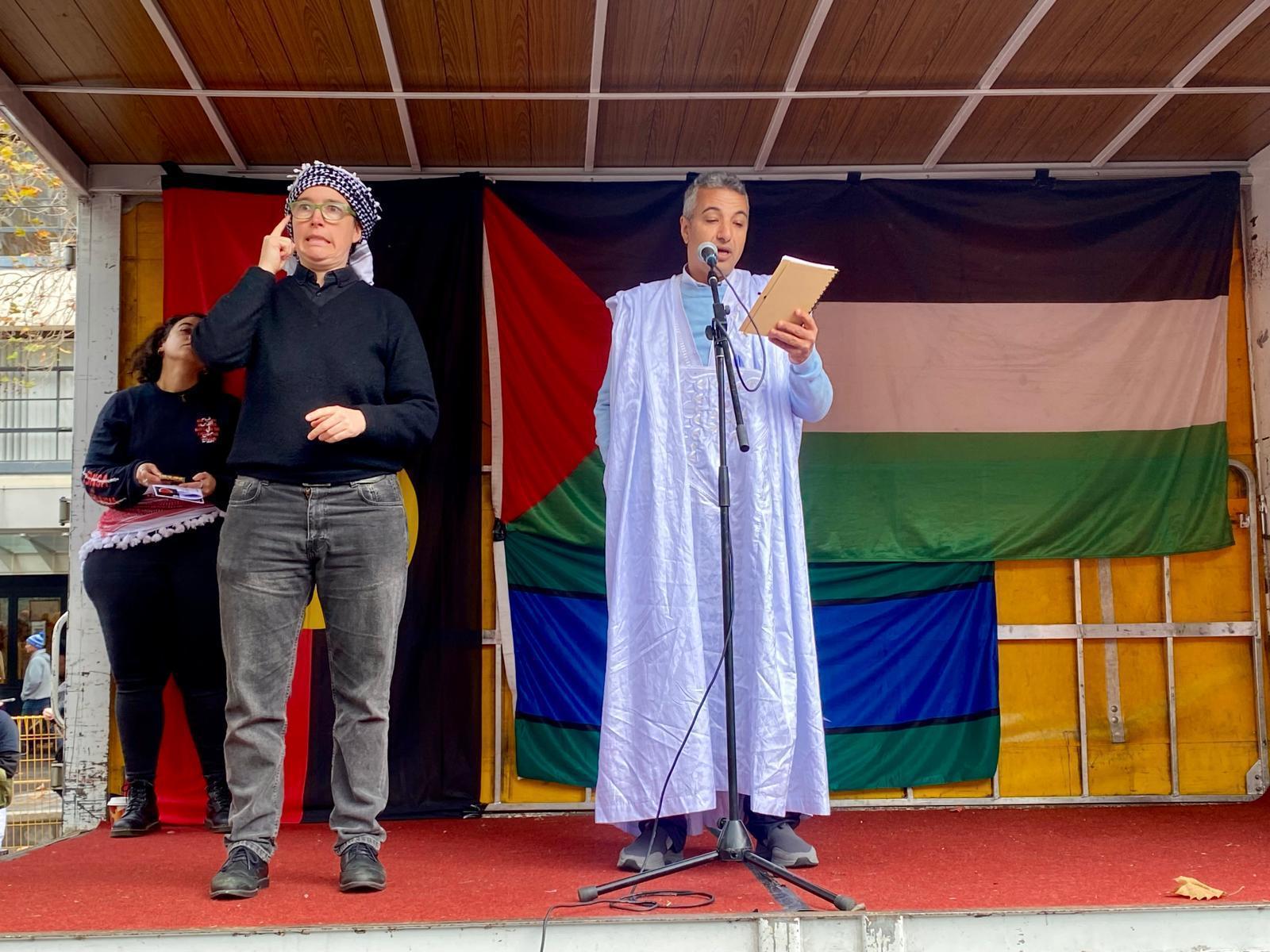 وكانت المظاهرة فرصة للناشط الصحراوي ومنسق ” ايكيب ميديا” محمد ميارة كي يلقي كلمة امام الاف المشاركين أكد خلالها على تضامن الشعب الصحراوي الثابت مع اشقائه في فلسطين