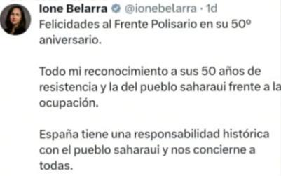 أفريقيا برس – الصحراء الغربية. أشادت وزيرة الحقوق الاجتماعية في الحكومة الاسبانية السيدة أيون بيلارا، في تغريدة لها على تويتر، بكفاح الشعب الصحراوي معربة عن كامل تقديرها للمقاومة التي يخوضها ضد المحتل المغربي.