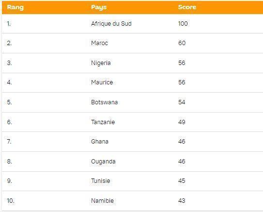 Le Maroc, numéro deux de cette liste, est éloigné du leader de 40 points, présentant un score de 60. Les trois pays suivants -le Nigeria, Maurice et le Botswana- suivent de près le Royaume chérifien, avec des scores respectifs de 56, 56 et 54. Ils clôturent ainsi le top 5 des pays africains avec les marchés les plus intéressants pour les investissements.