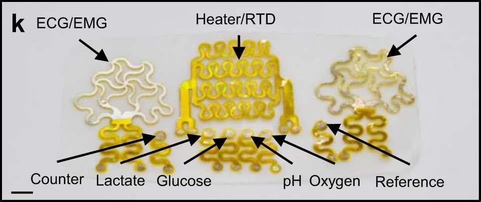 Pour séparer la couche métallique du support plastique, les chercheurs trempent le CD dans de l’acétone pendant une minute et demie. Le métal est prélevé grâce à une bande adhésive en polyimide qui sert aussi de support pour les capteurs. Ils utilisent ensuite une machine de découpe grand public (Cricut Maker) disponible pour quelques centaines d’euros afin de découper des motifs dans la couche métallique et créer ainsi les capteurs. C’est le type de motif spécifique qui détermine ce que mesure le capteur.