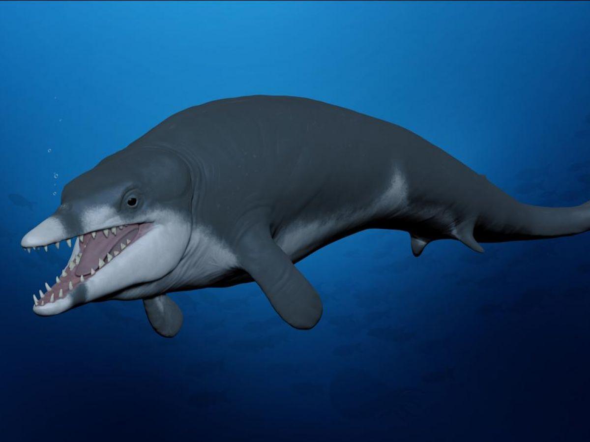 Les premières baleines, dont le genre Pakicetus (voir Tweet ci-dessous), sont apparues il y a 53 millions d’années et vivaient sur la terre ferme. A la différence de la petite baleine pharaon, Pakicetus avait un crâne allongé et des dents proéminentes adaptées à son régime carnivore. Toutefois, la structure de son oreille interne ressemble à s’y méprendre à celle des baleines modernes, ce qui laisse supposer que ce genre était en partie adapté au milieu aquatique. Tutcetus saute le pas : doté d’un corps plus fuselé et de membres postérieurs réduits, l’espèce est complètement adaptée à l’écosystème marin.