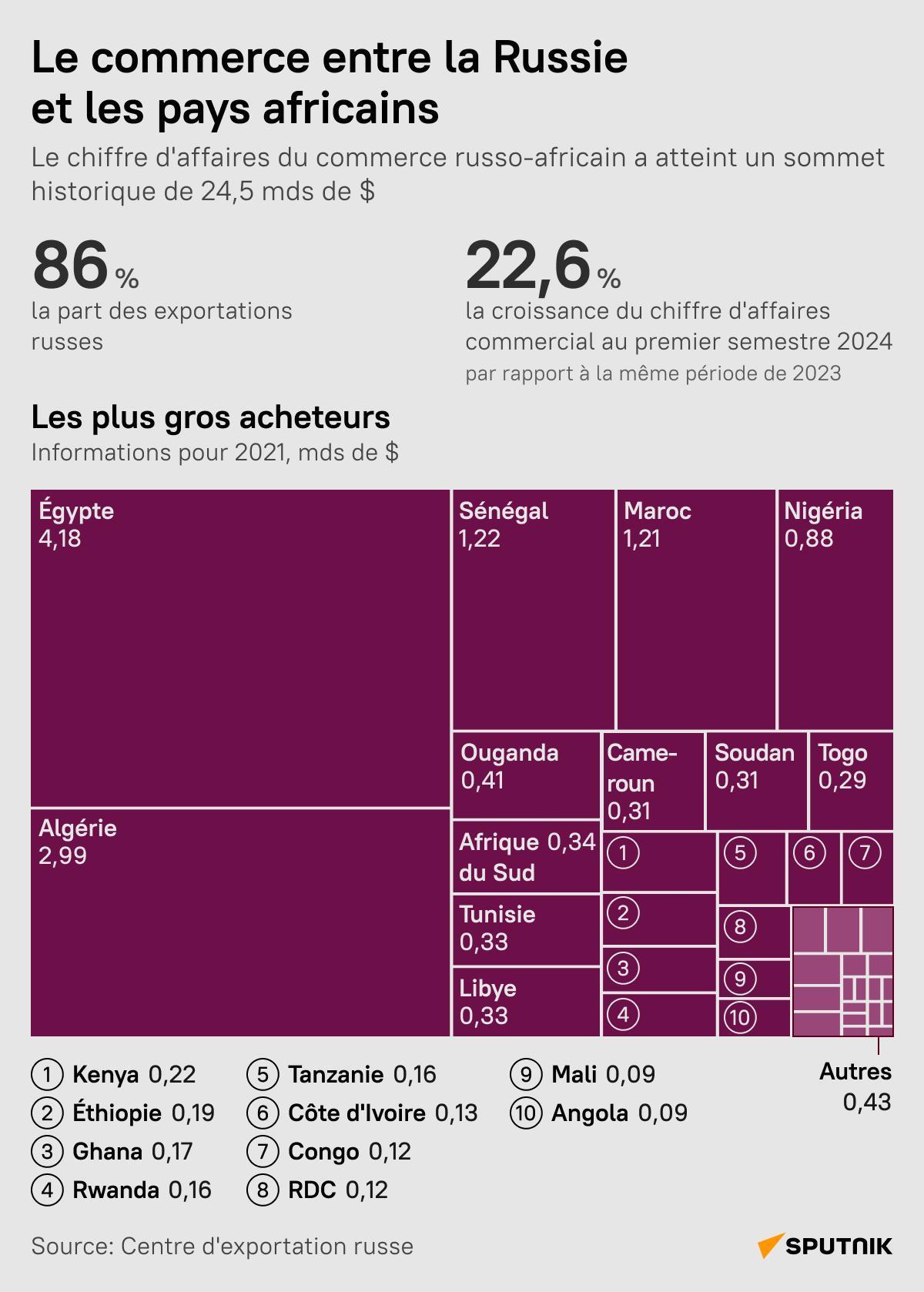 Africa-Press – Senegal. Le chiffre d’affaires commercial entre la Russie et l’Afrique a atteint un maximum historique, à savoir 24,5 milliards de dollars. Dans cette infographie, Sputnik fait état des plus gros acheteurs africains et de leurs parts dans ces échanges.