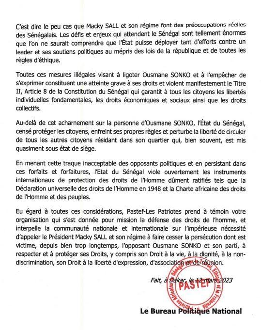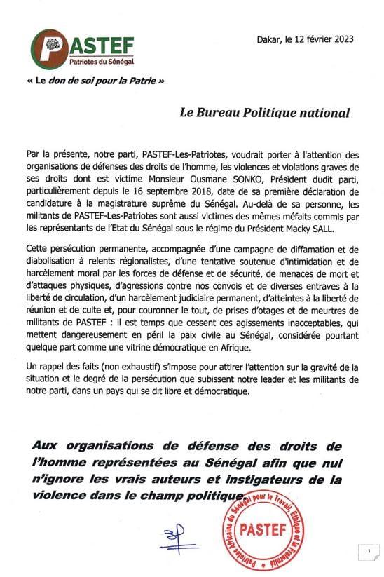Cette lettre a pour but d’attirer l’attention des organisations de défense des droits de l’homme « afin que nul n’ignore les vrais auteurs et instigateurs de la violence dans le champ politique » précise le bureau politique national du parti Pastef.