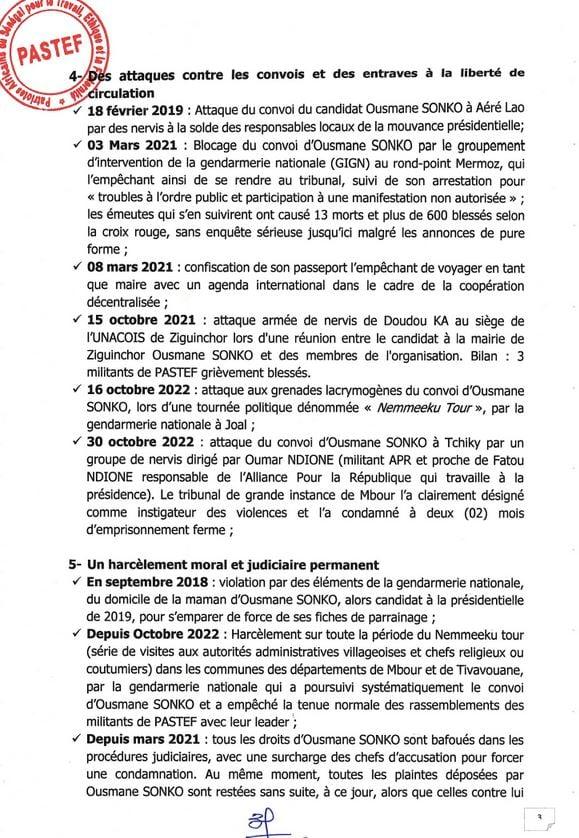 Africa-Press – Senegal. Le Bureau politique (BP) des Patriotes africains du Sénégal pour le travail, l’éthique et la fraternité (PASTEF) a publié un document de cinq pages dans lequel, ils listent les “violences et violations” dont seraient sujets le chef de file du parti, Ousmane Sonko, ainsi que beaucoup d’autres membres du mouvement.