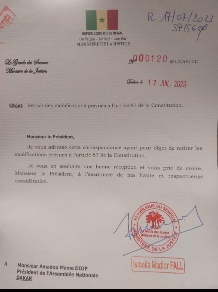 « Monsieur le Président, je vous adresse cette correspondance ayant pour objet de retirer les modifications prévues à l’article 87 de la Constitution », a notamment écrit le Garde des Sceaux, dans cette note parcourue par Seneweb.