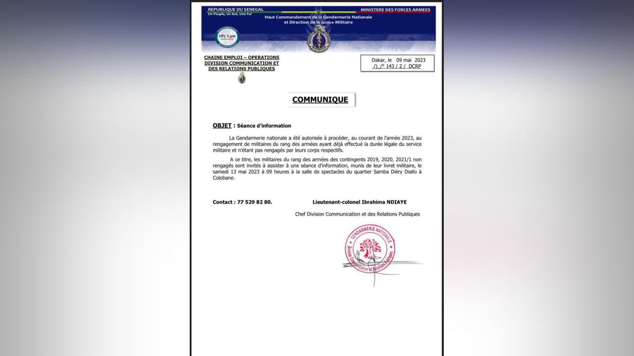 Dans une document officiel, la Gendarmerie nationale a invité les militaires du rang des contingents 2019, 2020 et 2021/1 non rengagés à assister à une « séance d’information ». Cette séance aura lieu le samedi 13 mai 2023 à 09 heures à la salle de spectacles du quartier Samba Dièry Diallo à Colobane. Les militaires intéressés sont invités à se munir de leur livret militaire.