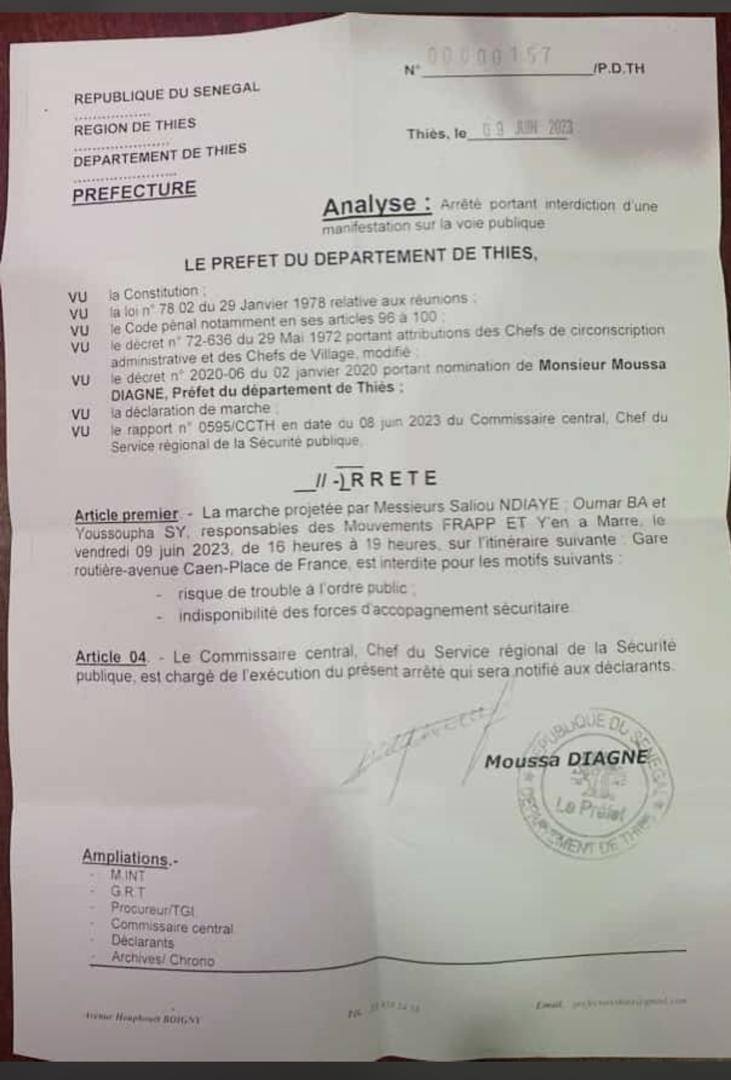 Africa-Press – Senegal. La marche de F 24 a été interdite à Thiès. L’autorité invoque les risques de troubles à l’ordre public et l’indisponibilité des forces d’accompagnement sécuritaire. C’est ce qui est ressortie de la note du préfet du département de Thiès, Moussa Diagne.