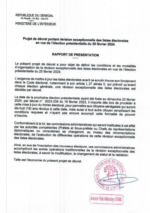 En conseil des ministres ce mercredi 08 mars, le président de la République avait demandé au ministre de l’Intérieur, chargé des élections, « d’accomplir, conformément au décret n° 2023- 464 du 07 mars 2023, toutes les diligences nécessaires au bon déroulement de la révision exceptionnelle des listes électorales en vue de l’élection présidentielle du 25 février 2024, sur l’étendue du territoire national et à l’étranger pour le vote des Sénégalais de l’extérieur ».