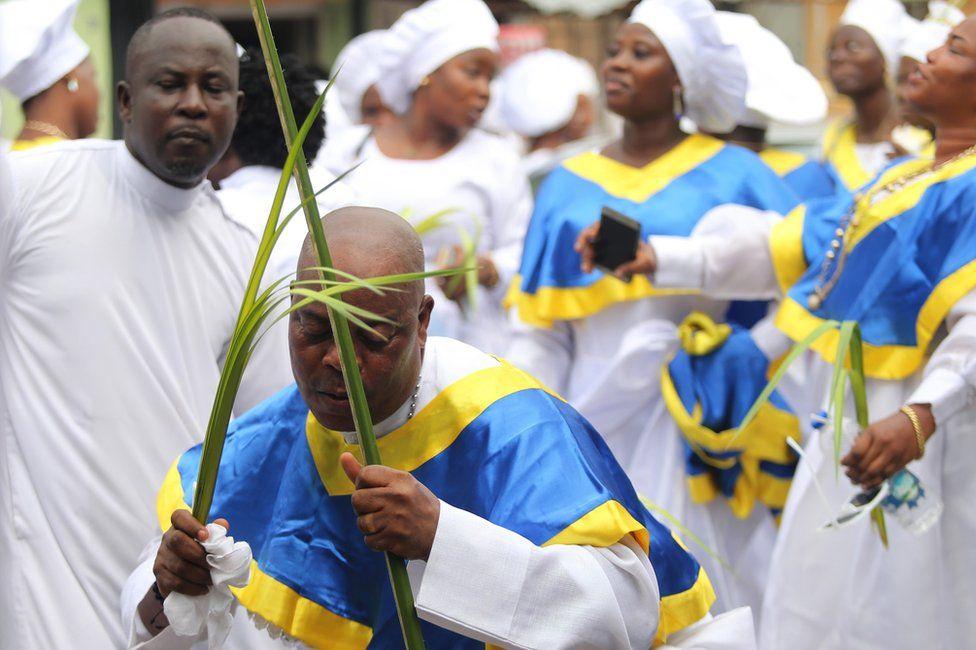Africa-Press – Seychelles. Members of Nigeria’s Celestial Church of Christ join Christians worldwide to celebrate Palm Sunday in Lagos.