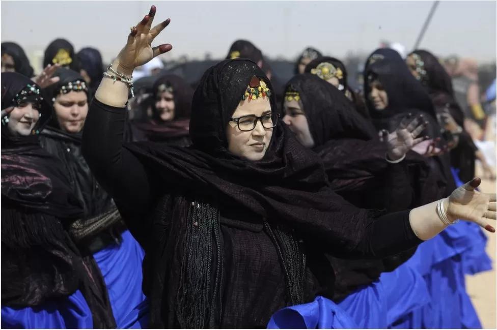 A group of women attend a parade on Saturday in Algeria’s capital Algiers to celebrate the 50th anniversary of the Polisario Front. The movement is fighting for the independence of Western Sahara. Morocco currently controls around 80% of the territory and the rest is held by Polisario.