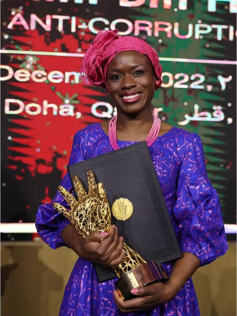 Nigerian professor of law, public procurement scholar and anti-corruption advocate Sope Williams poses as she wins the Sheikh Tamim Bin Hamad Al-Thani International Excellence Award in Qatar. The prize is for those who have fought against corruption in their work.