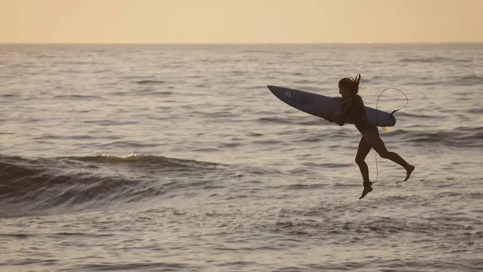 As the sun rises on South Africa’s east coast on Sunday, a surfer jumps into the ocean.