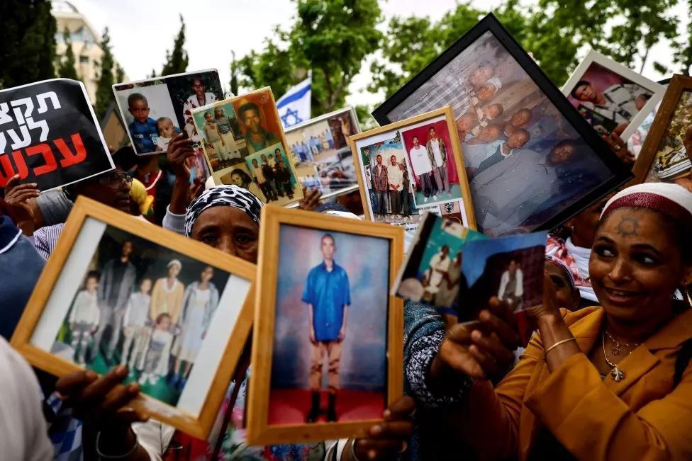 The next day, Israelis of Ethiopian descent hold up pictures of their relatives during a protest in Jerusalem calling on the government to stop a freeze on Ethiopian Jews emigrating to Israel.