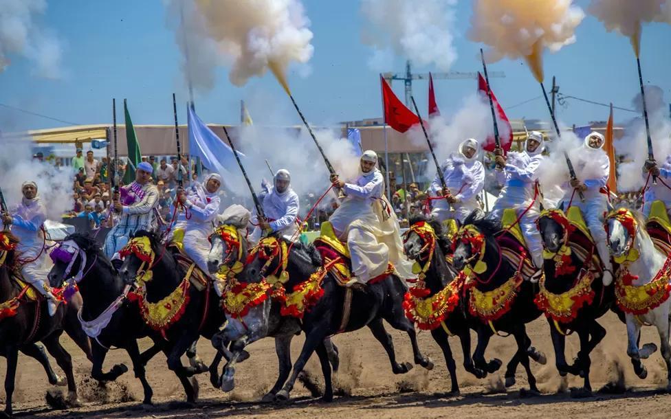 Horse riders perform in an equestrian Moroccan artform, dating back to the 16th Century, known as the “Tbourida”, in the coastal city of Bouznika on Wednesday.