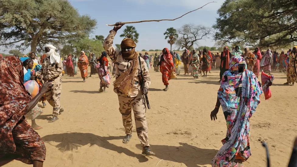 But the situation for some in Koufroun is desperate. Here Sudanese refugees dodge a stick-wielding soldier trying to maintain order as supplies from a Turkish aid group begin to run out on Sunday.