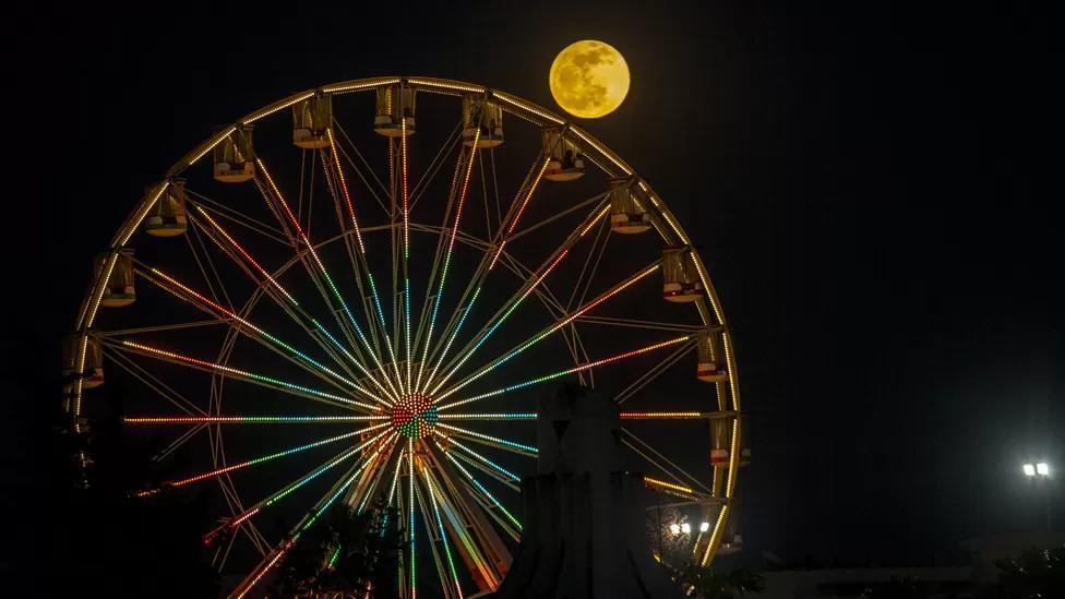 That evening, the full moon is seen near a Ferris wheel in Tunisia’s capital, Tunis.