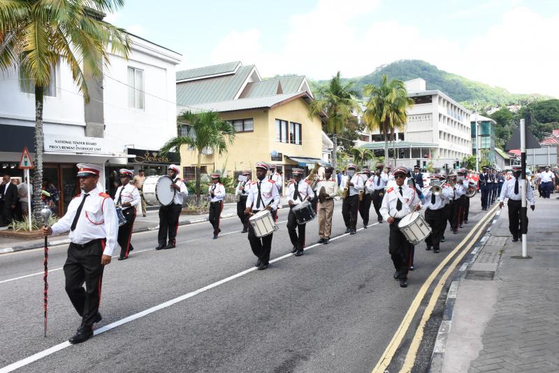 The church service was followed by the ceremonial parade through town, led by the National Brass Band, which attracted a large group of onlookers, both locals and foreigners. The parade started from the church, to the clock tower and along the Independence Avenue, till the Bicentenary monument, before returning along the other lane of the Independence Avenue to the clock tower and to the Victoria gymnasium, where there was a motorcade to the Palais de Justice. Upon arrival at the Palais de Justice, the Chief Justice inspected the Guard of Honour before a group photo.