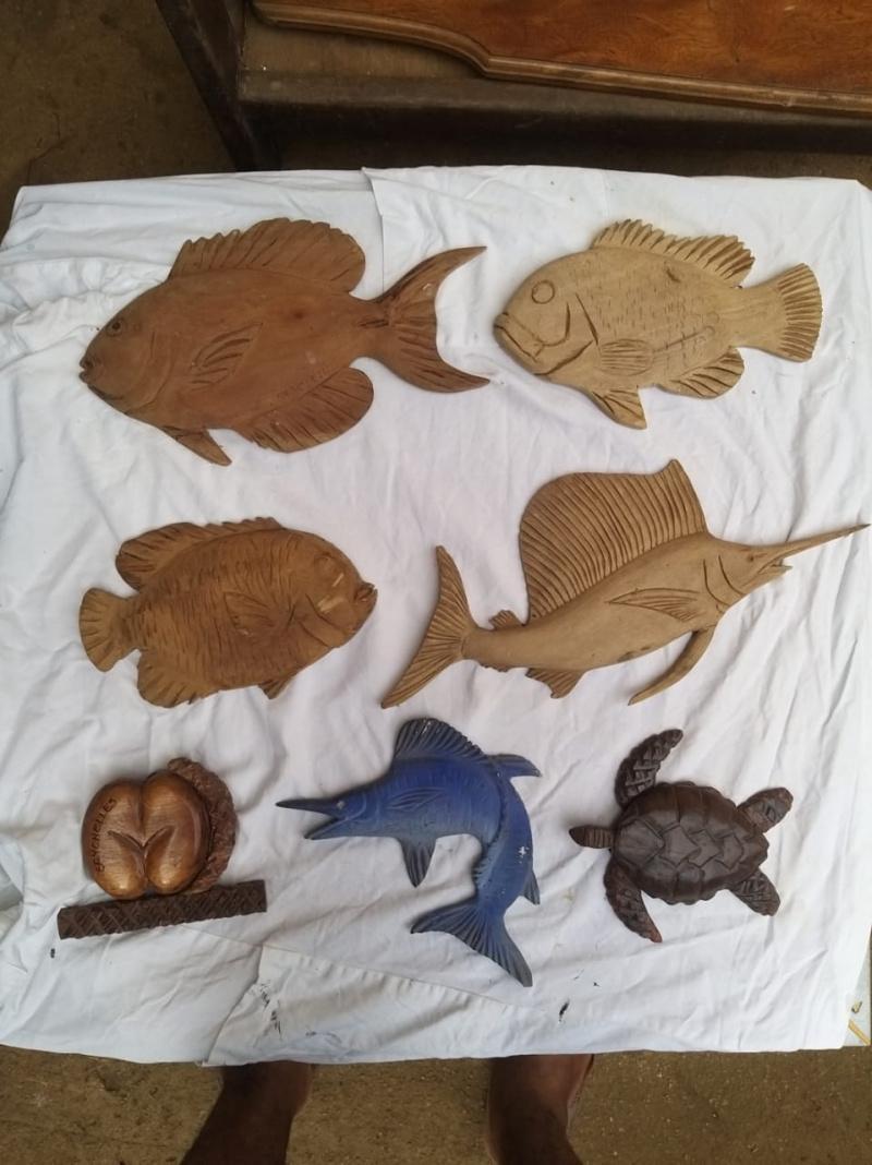 Mr Marie remarked that in no time he had assembled a remarkable number and assortment of artifacts, big and small, namely tortoises, fish, coco-de-mer nuts, sea turtles to name but some which he had painstakingly polished and varnished.