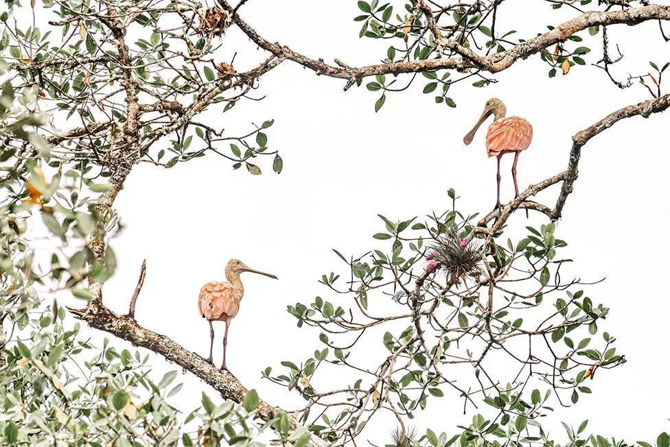 The preserved mangroves of Guaraqueçaba are an important place for visitors, including this pair of Roseate Spoonbills (Platalea ajaja).