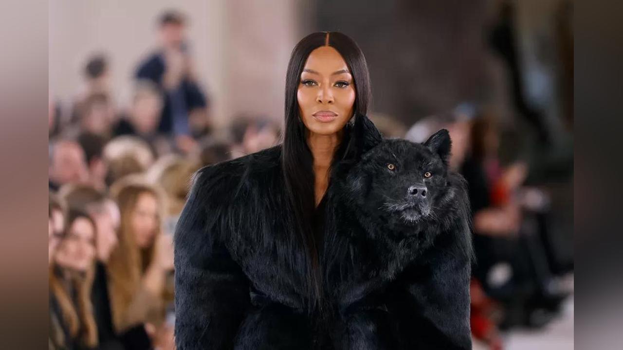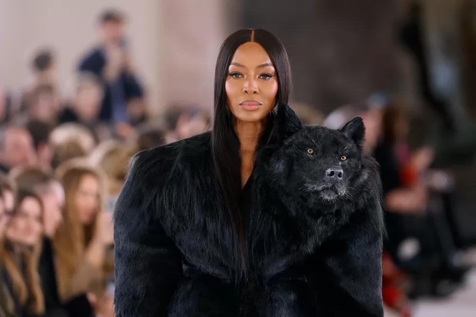 Naomi Campbell walked the runway in a faux taxidermy wolf during Schiaparelli’s show.