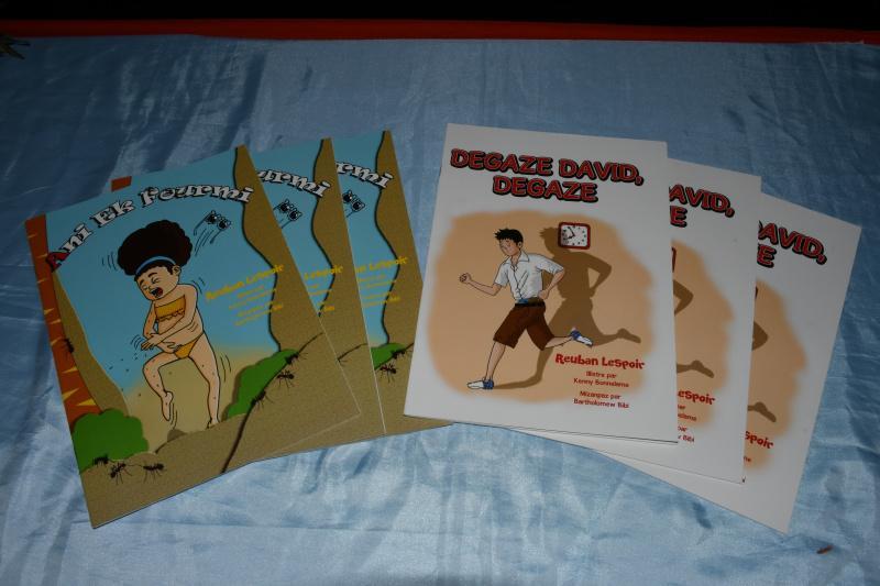 These two books with colorful animated characters and large letters, ‘Ani and Fourmi’ and ‘Degaze David Degaze’, are part of his prose twenty books of Creole history for children that he intends to produce in accordance with the twenty letters of the alphabet that are used Creole teeth.