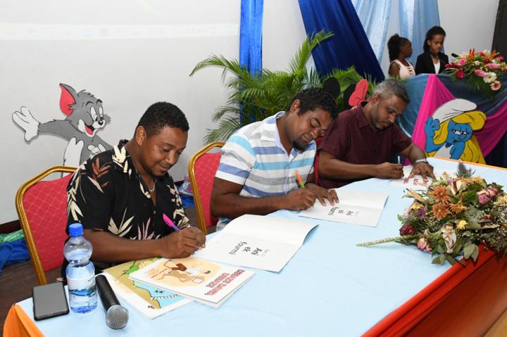 During the ceremony, Mr. Lespoir, Mr. Bibi and Mr. Bonnelame signed copies of these two books, after which copies were handed over by the children of the family to some of the guests who were present. The audience also had the pleasure of listening to some excerpts of poems written by Rueban read by the children of Bling Bling, the Seychellois poetic association that Reuban belongs to. Two other fellow poets in the Bling Bling association, Stephanie Joubert and Vincent Milius, also presented a piece of their composition.