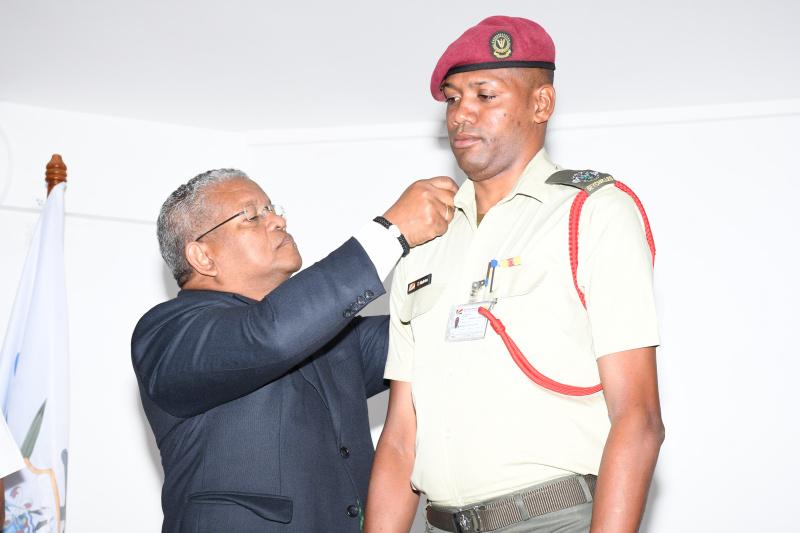 During the ceremony, President Ramkalawan had the honour of promoting several officers to higher ranks. Dave Mathieu was promoted from the rank of Captain to Major. Five others were promoted to the rank of Captain, namely, Lieutenant Marlon Charlie, Lieutenant Stan Tomking (on overseas course), Lieutenant Dennis Jeremie, Lieutenant Luigi Loiseau (absent at sea), and Lieutenant Edwin Constance.
