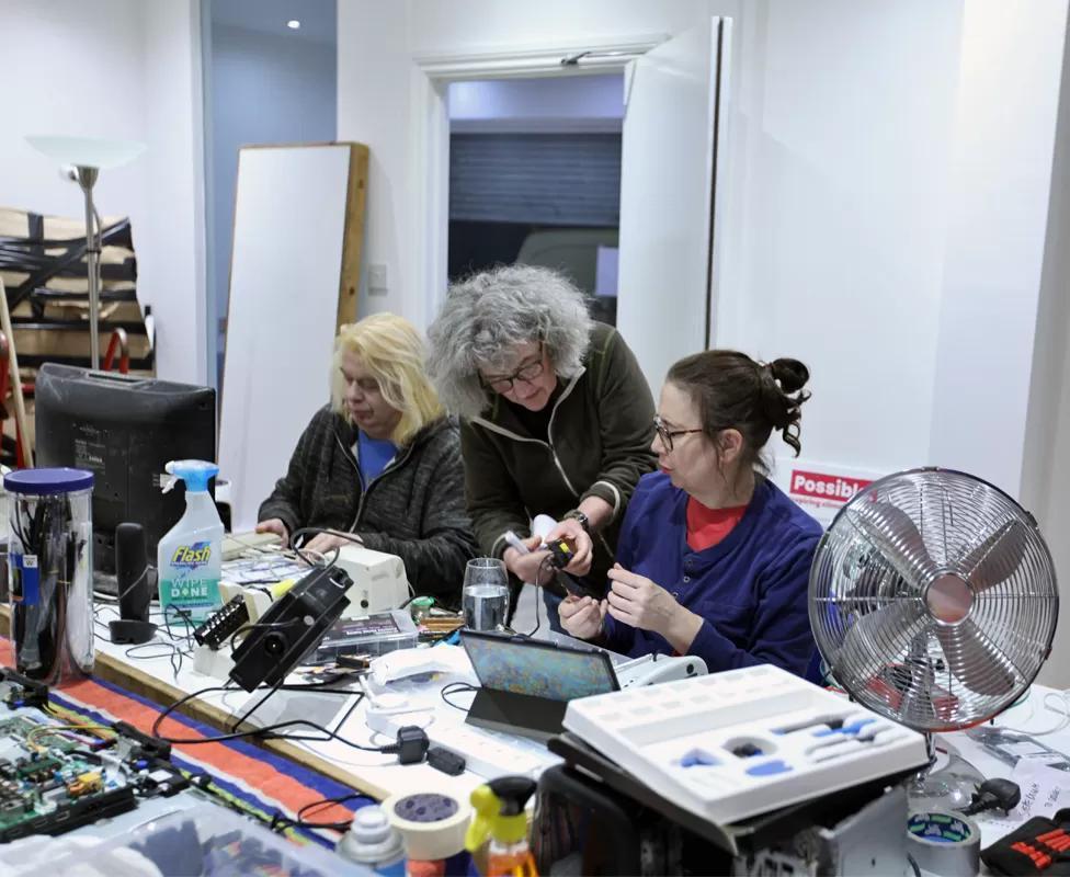 “A lot of us are feeling pretty powerless in the face of the climate crisis,” Dermot Jones (below, second left), project manager for the Camden branch, says. “Throwaway consumerism and the escalating cost of living just compounds that powerlessness.” Enabling people to get “hands-on” with repairing their own stuff hands them back some of this lost power.