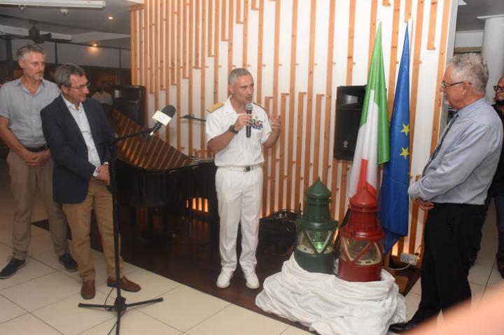 The handover of the two lightsto Designated Minister Jean-François Ferrari by Rear Admiral Fabrizio Bondi from the Italian Navy vessel Carlo Bergamini, docked in Port Victoria, took place on Saturday afternoon during a small ceremony held at the Gastro Lounge, Bel Ombre.