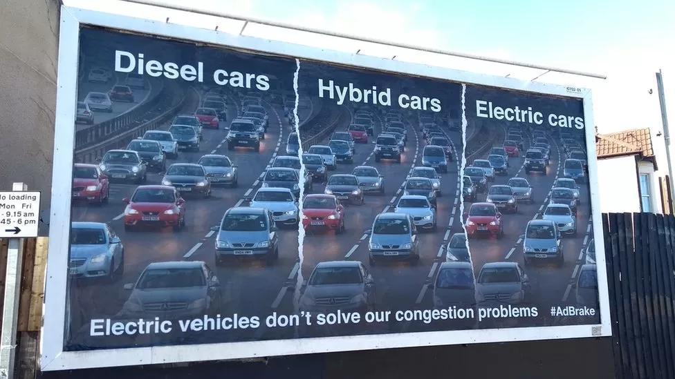 Brandalism, a collective of activists, is another such organisation. It particularly targets adverts promoting cars, airlines and energy firms, such as putting up fake billboard posters of cars stuck in traffic jams, or altering legitimate posters to call for the banning of fossil fuels.