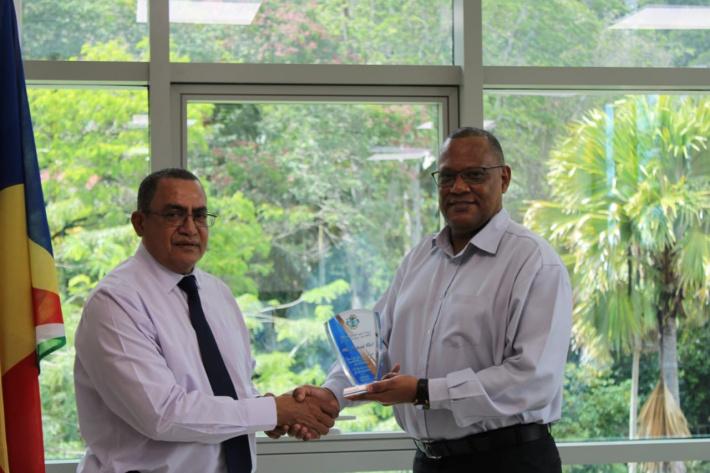 Minister Derjacques presented Mr Vel with a token of appreciation for his service.
