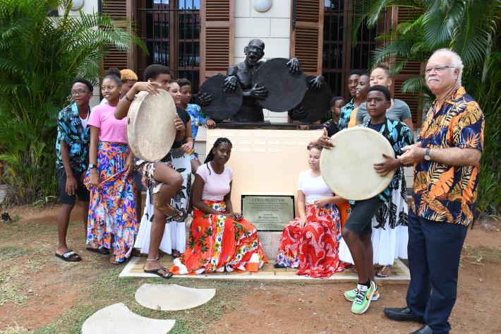 The statue, dubbed ‘Leko Moutya’, depicts a male person singing while beating a ‘moutya’ drum and flanked by two other ‘moutya’ drums.