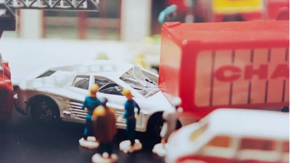David took a photo of the crash scene and then recreated in miniature at art school in 1998